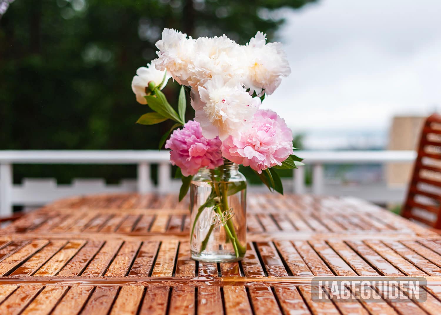 Siden blomstene blir så store og tunge, er det lurt å støtte opp peonene med ståltråd eller spesielle plantestøtter som du får kjøpt i hagesenteret.