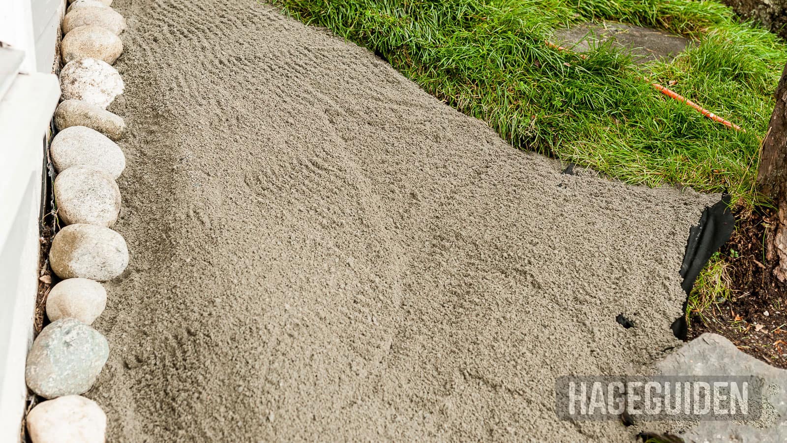 3. I en øverste delen, som er minst bratt, la vi et lag med subbus (sand). Det stygge plastrøret pakket vi helt inn i sand, slik at sedumen kan vokse over og skjule det helt.