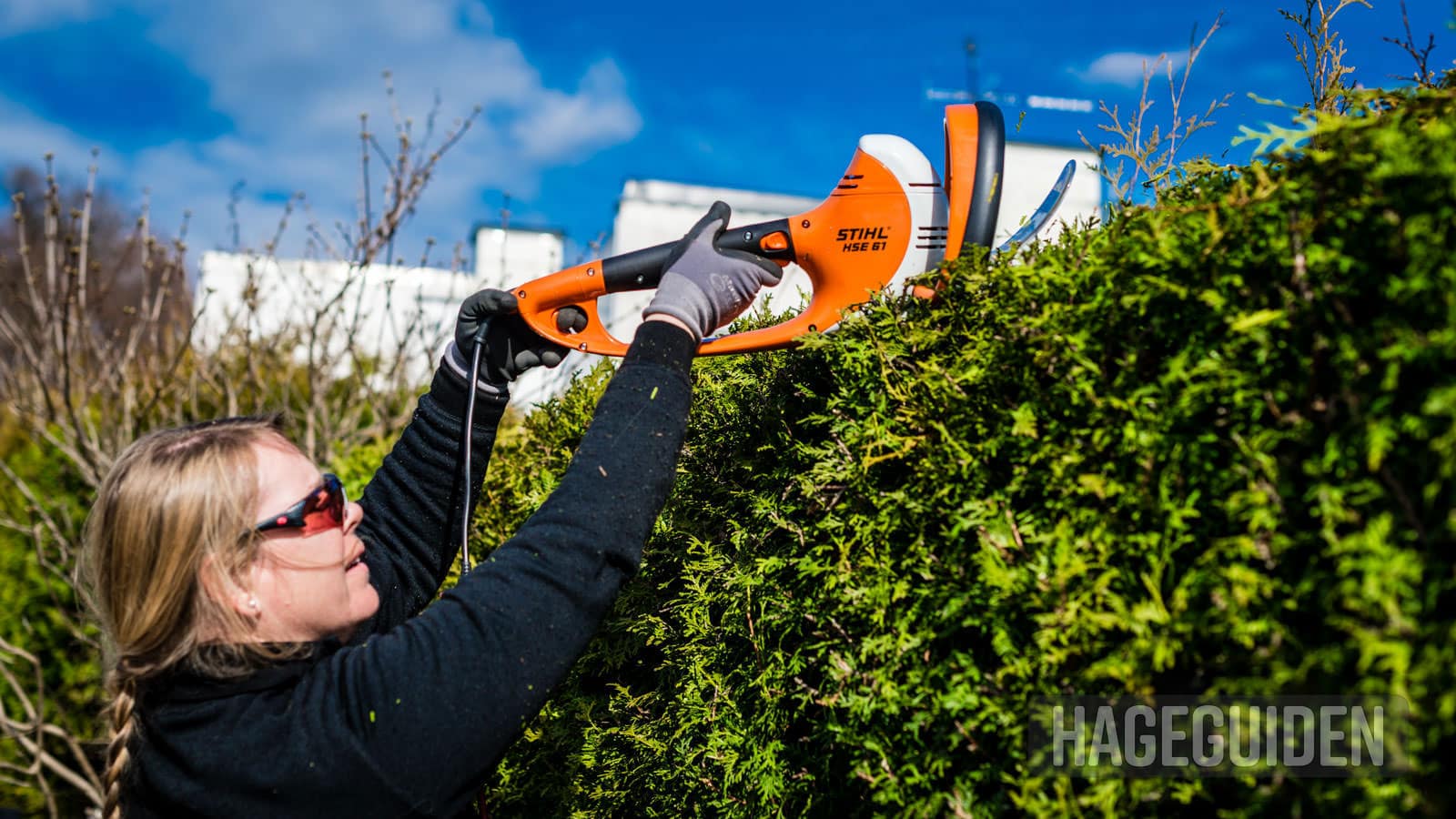 Når tujahekken har nådd den høyden du ønsker at den skal ha, må du beskjære toppen jevnlig. Kjersti Bergerud demonstrerer her en elektrisk hekktrimmer fra Stihl, som har et praktisk tohåndsgrep.