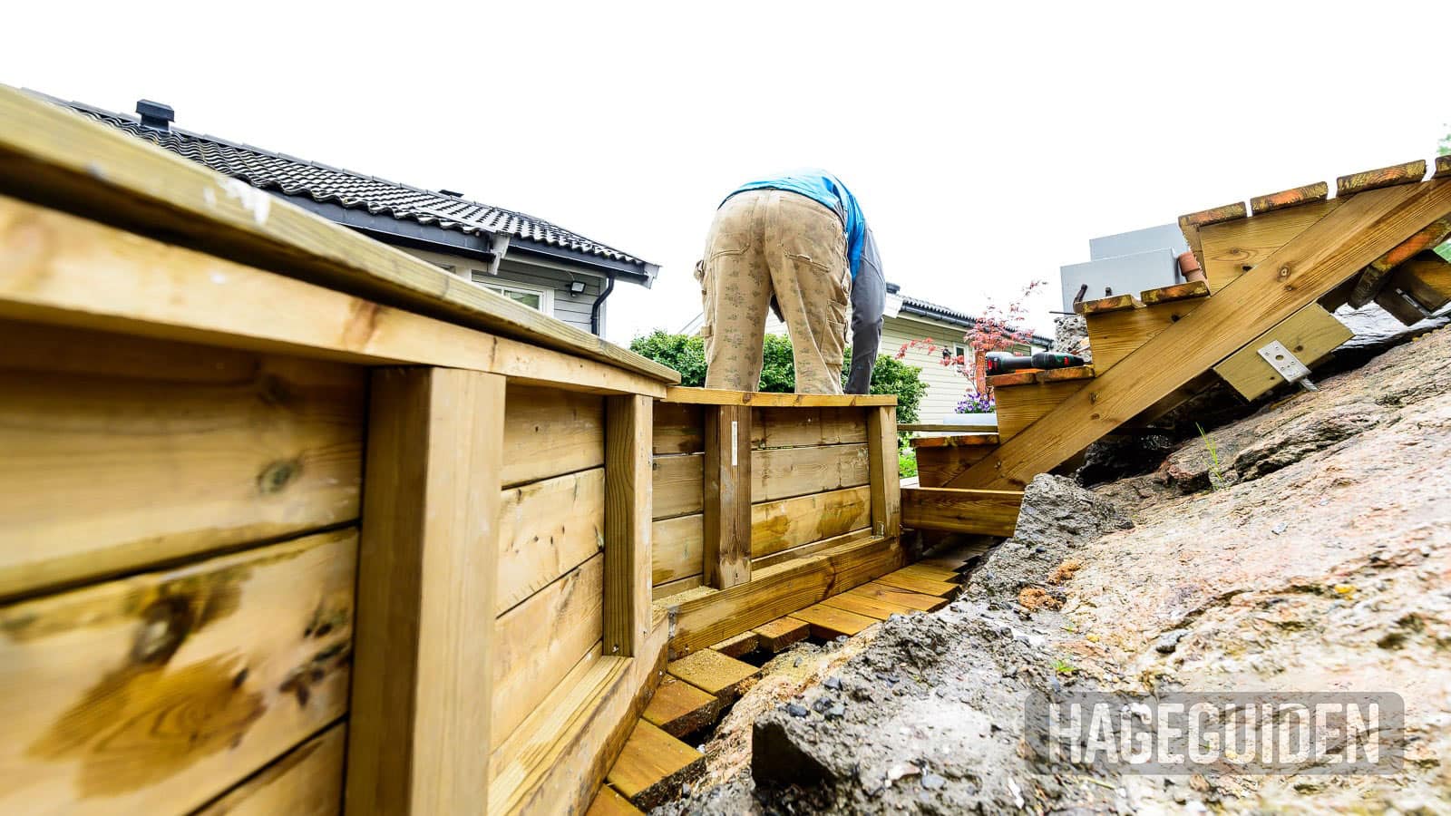 Vi brukte konstruksjonsvirke 48 X 98 mm, til å bygge reisverket til det opphøyde bedet. Så kledde vi inn det hele med vanlige terrassebord.