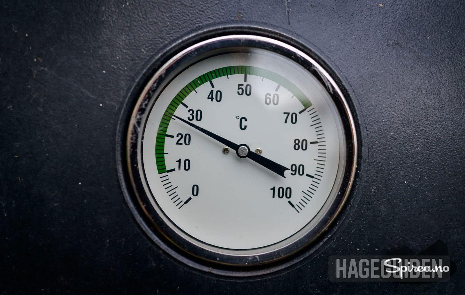 Det er kjekt, men ikke nødvendig å ha termometer på varmkompostbingen. Hvis prosessen går som den skal, vil varmen slå i mot deg når du åpner lokket. Her har vi akkurat rørt om så det er ikke så varmt som det pleier, men god temperatur nede i selve komposten.