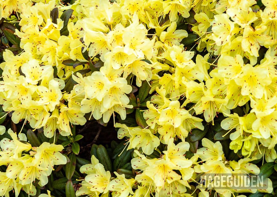 Lysegule rhododendron i full blomst.