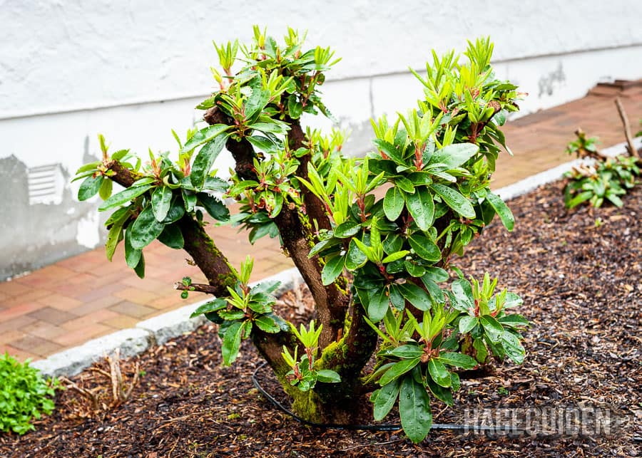 Hvis rhododendron er blitt for stor eller glissen nederst, kan den klippes ned slik det er gjort her.