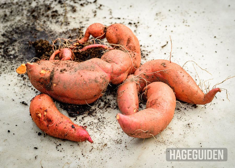 Når bladene er begynt å bli gule er det på tide å ta opp søtpotetene, da er sesongen over. De tåler absolutt ikke frost, så hvis nattetempen begynner å gå under 10 grader bør du også høste inn.