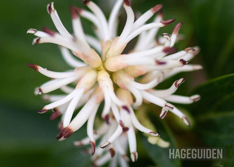 Vinterglans selges som en staude, men er egentlig en bitteliten busk i buksbomfamilien. Den sprer seg med rotutløpere og danner raskt et tettvoksende teppe. Og det er det vi vil ha på det stedet vi har plantet den.