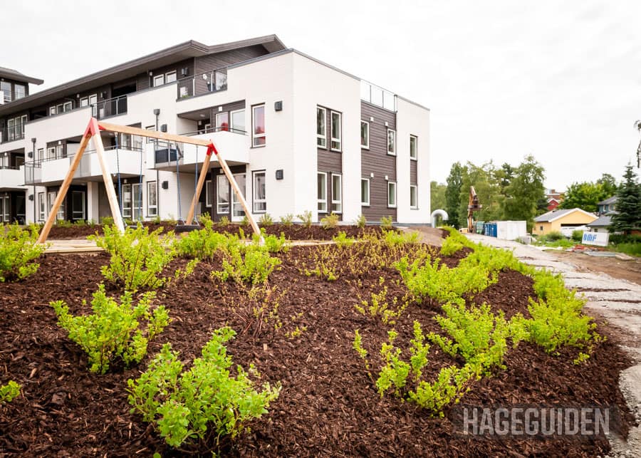 Her er det brukt bark for å dekke en skråning med prydbusker. Om noen år vil buskene dekke hele feltet, men inntil videre er det smart å gjøre tiltak for å unngå for mye ugress.