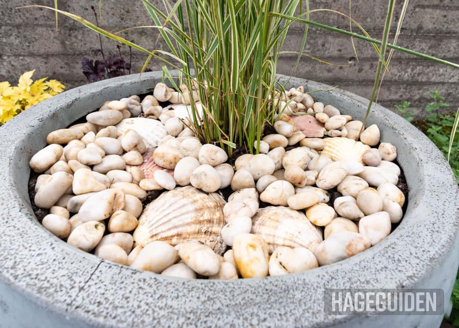 I krukker tørker jorda ekstra fort ut. Her har vi brukt dekorstein og skjell som jorddekke i en stor krukke der vi har plantet prydgress. Vi gjør det først og fremst fordi det ser pent ut, men det har også andre positive effekter.