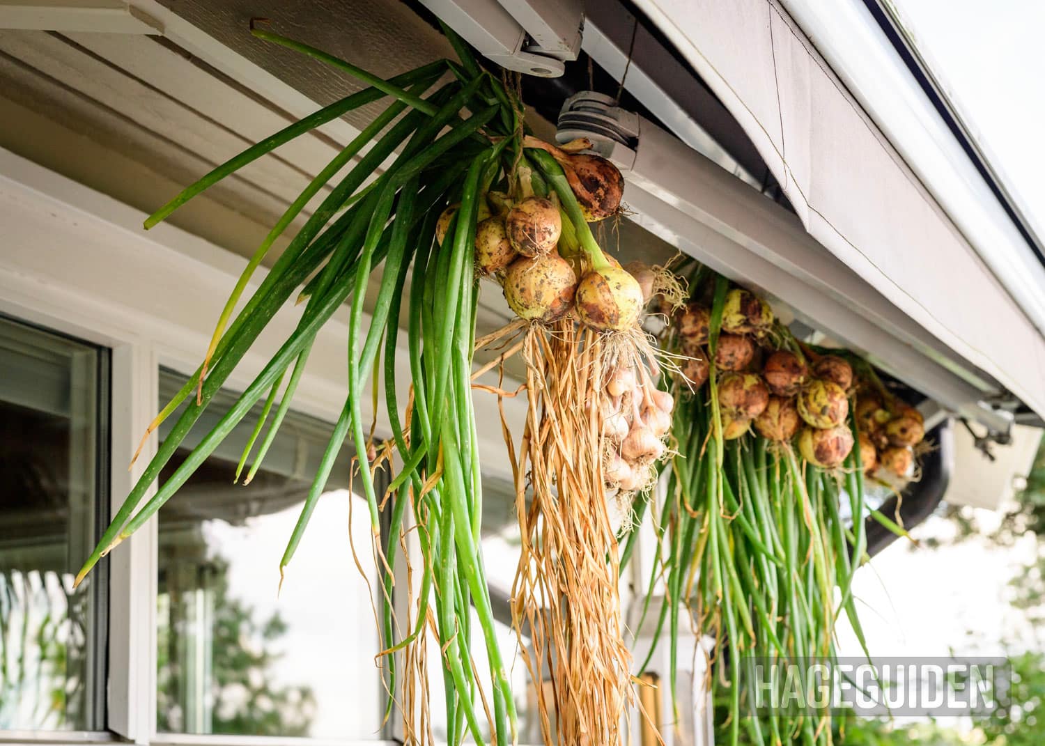 Det er flere måter å lagre løk på, men du bør unngå både kjøleskap og innpakning i plast. Vi har valgt å henge de ferdig høstede løkene i bunter under takutstikket, der er det tørt og luftig.