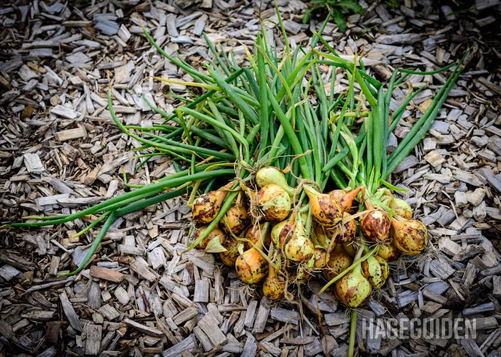 På ettersommeren danner løkene det brune «ytterskallet» og det er på tide å høste dem.