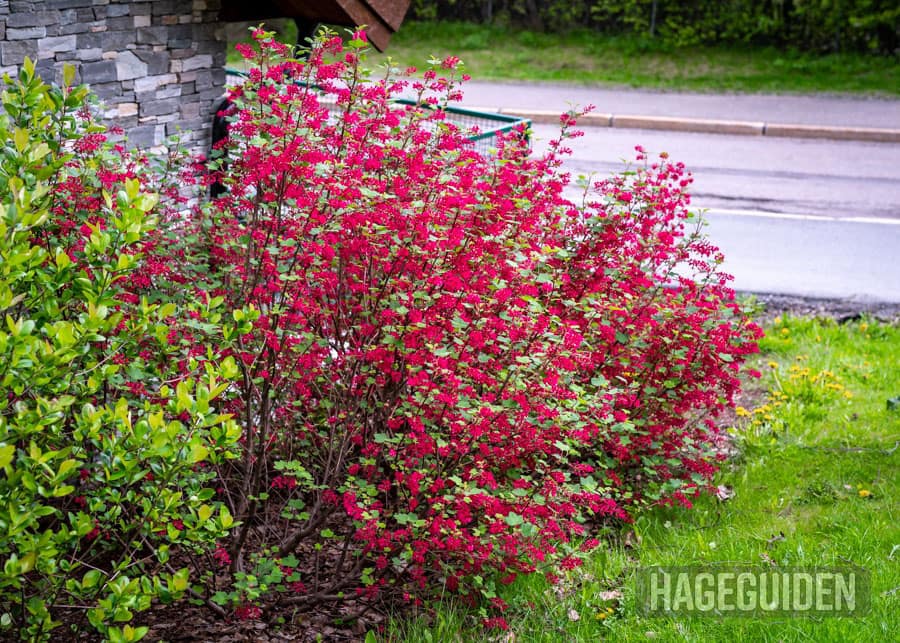 Et flott eksemplar av en blodrips (Ribes sanguineum) som ikke er «vaktmesterbeskjært» men har fått lov til å vokse i sin naturlige form.