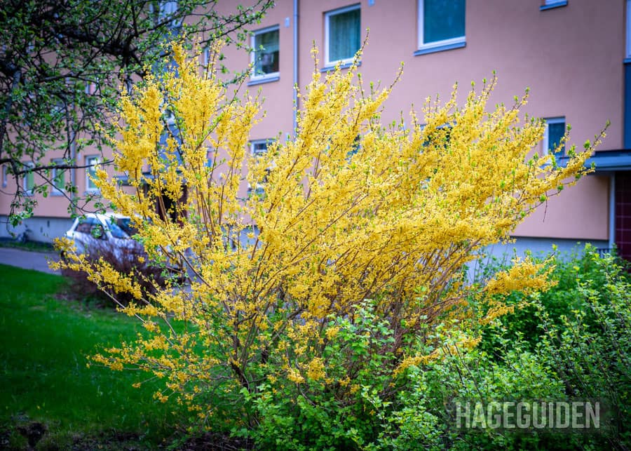 Gullbusk (Forsythia) blomstrer egentlig litt tidligere på våren, men denne står på en plass med skygge og holder gående en stund etter at «brødrene» har gitt seg.