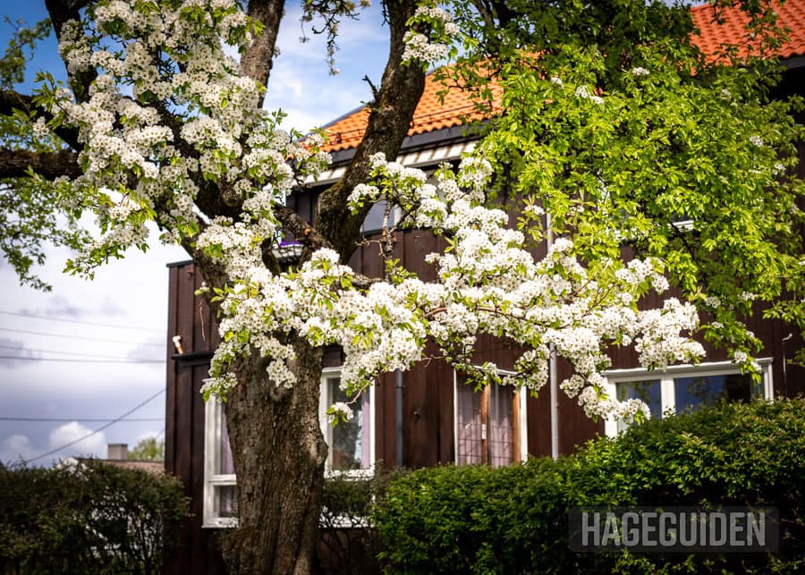 Et kjempestort pæretre har stått i denne hagen i mange år, og nå står det i full blomst.