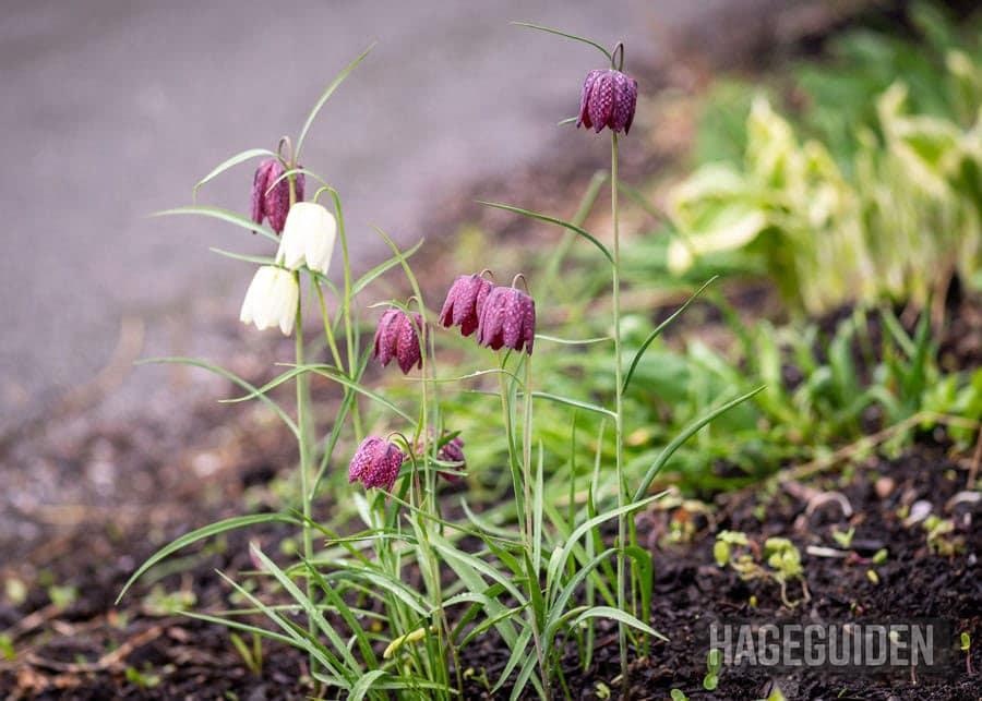 Rutelilje (Fritillaria meleagris) er ikke den mest prangende blomsten du kan ha i hagen, men vi synes den er utrolig kul. Den klokkeformede blomsten med det spesielle rutemønsteret gjør at du legger merke til den selv om den ikke er mer enn 20-30 cm høy.Vi satte ruteliljer i hagen for noen år siden, og etter det har vi ikke gjort noe som helst med den. Det er utrolig kjekt med planter som kommer fra flerårige løker – det er bare å la dem stå så klarer de seg selv.