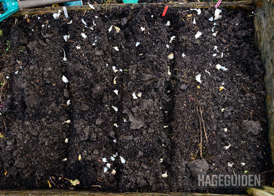 Hvitløksfeddene kan settes i rader. 10-15 cm mellom hvert fedd og 30 cm mellom hver rad.