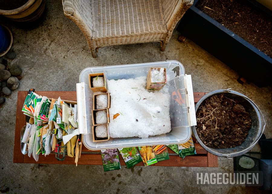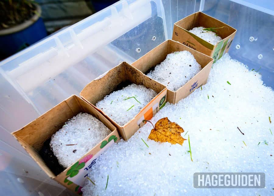 Snø er fint å bruke til å dekke pottene med de nysådde frøene. Hvis du ikke har snø, kan du i stedet vanne rett etter såing.