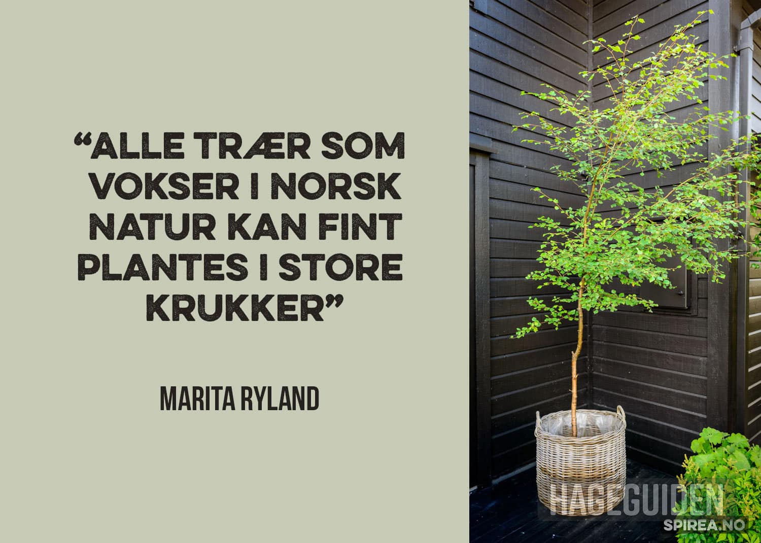 – Alle trær som vokser i norsk natur kan fint plantes i store krukker. Bjørk, rogn, furu og gran er alle hardføre nok til å overvintre i krukker i det meste av landet. Hvis du bare husker å vanne, vil du kunne ha glede av dem i flere år. Etter hvert som de vokser seg for store, kan du bytte dem ut med noen nye, tipser Marita Ryland.