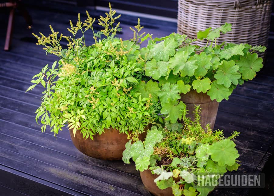 Ved å sette noen krukker i en gruppe på plattingen, får du et grønt og frodig miljø. Marikåpe og den hardføre stauden Astilbe er utmerket å bruke i krukker.