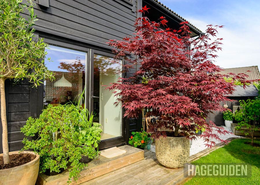 Marita i Bergen har en gedigen japansk blodlønn plantet i krukke, som står ute året rundt. Det går fint i klimasone H2, men ikke de fleste andre steder i landet.