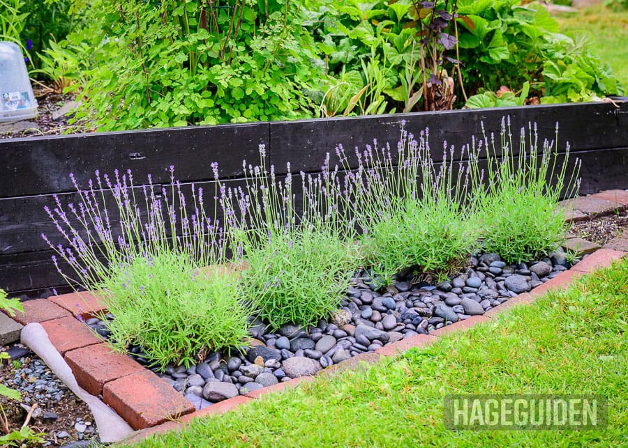 Lavendel er egentlig ikke hardfør nok til klimaet i Tromsø. Men det finnes noen triks: Disse plantene har Lena dyrket frem fra frø, og stein i bedet vil samle varme som gir bedre mikroklima.
