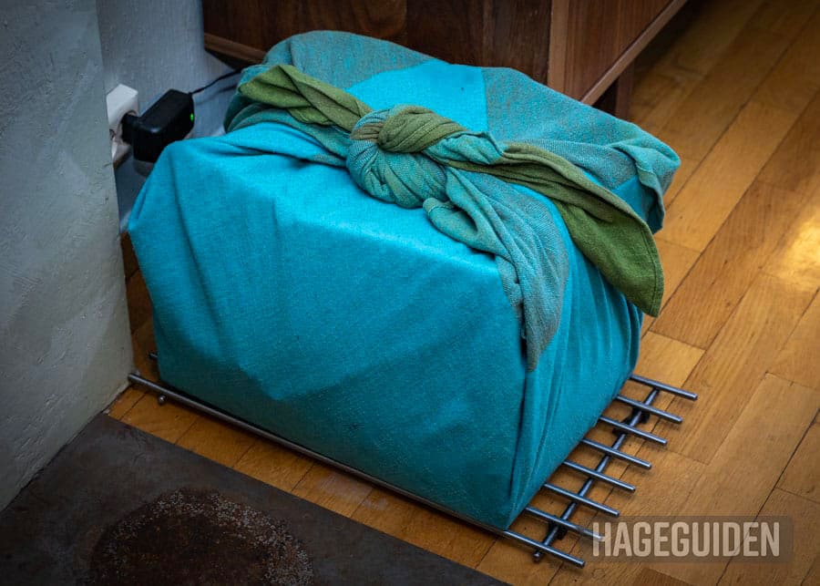 På toppen legger du en avis eller et klede, og så pakkes hele esken inn i et tekstil, en duk eller lignende passer bra. Esken må stå litt opp fra gulvet, på en rist for eksempel.