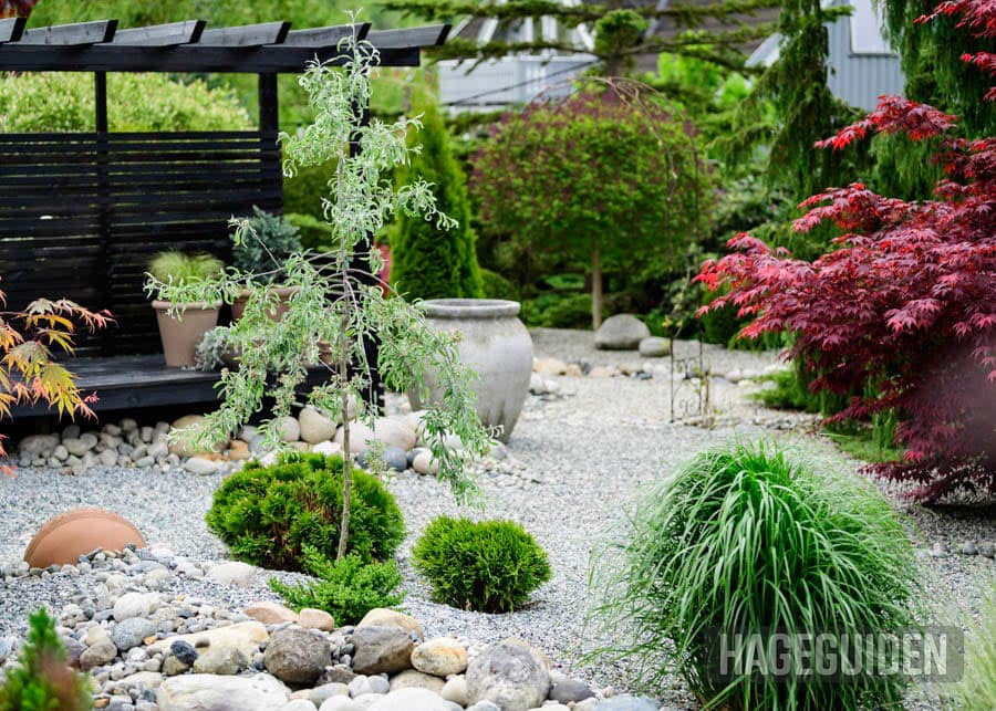 Opp fra grusen stiger de vakreste planter – japanske lønner, hjertetre, prydgress, dvergsyrin, rhododendron og ulike vintergrønne busker og trær.
