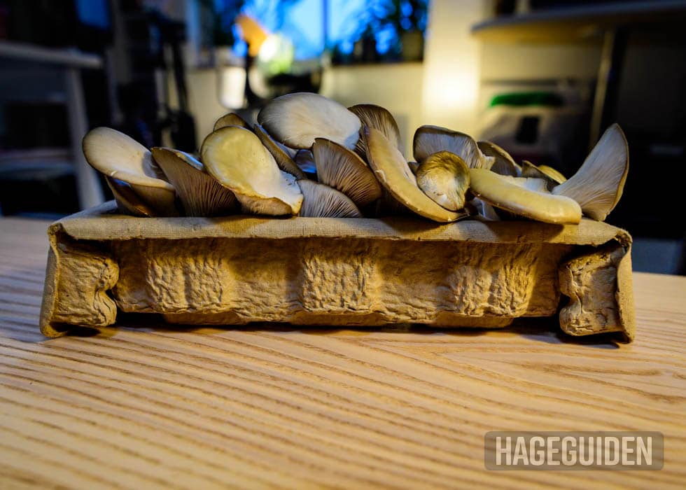 Dette er 140 gram østerssopp, som i matbutikker har en kilopris på mellom 170 og 220 kroner. Etter høsting kan østerssopp oppbevares i en eske i kjøleskapet – obs: Ikke i tett plast.