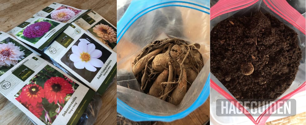 Du kan fordrive georgineknoller i gjennomsiktige plastposer. Legg litt jord over og under knollen og hold jevnt fuktig, men ikke veldig vått.