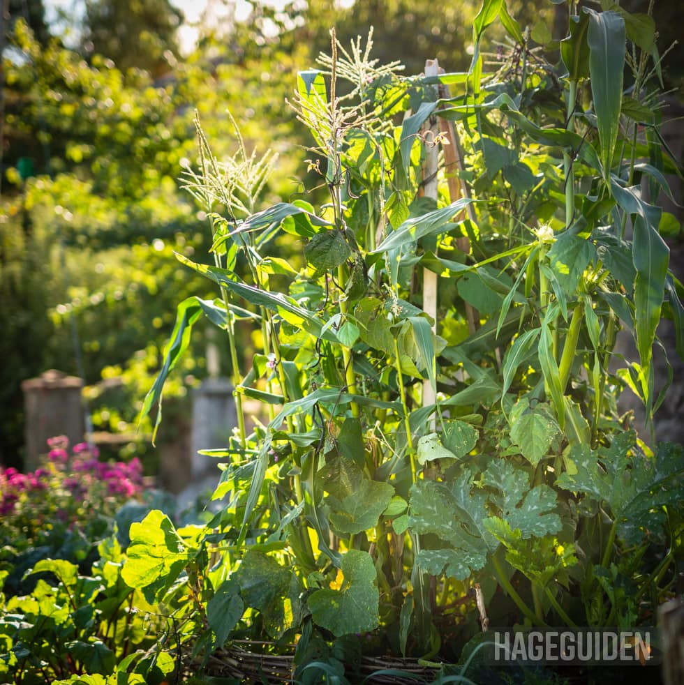 “Tre søstre” er helt genialt hvis du har liten plass å dyrke på. Tenk deg selv: En gresskarplante dekker gjerne minst en kvadratmeter på bakken. Maisplanter blir høye med sterke stengler, og de liker å stå mange sammen. Og bønne-plantene trenger noe å klatre på.