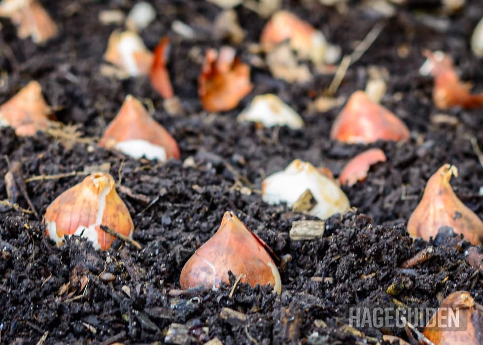 Husk å sette løkene med spissen opp. Er løken 5 cm høy, dekk med 10-15 cm jord.