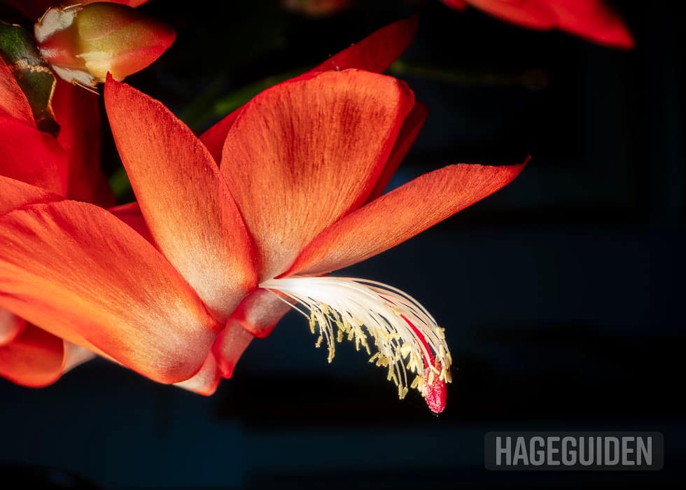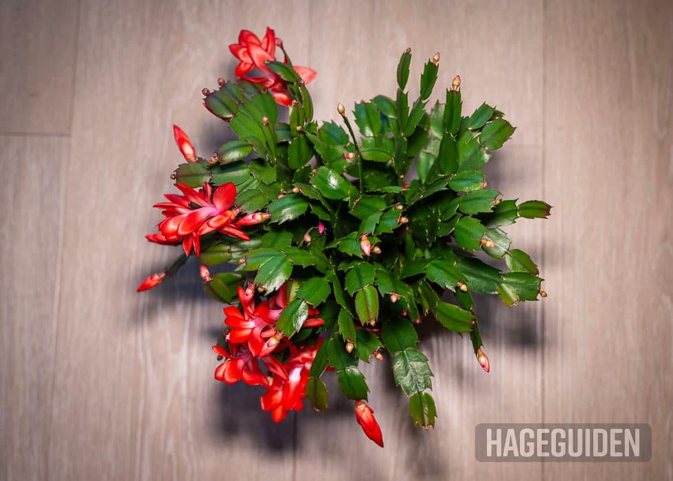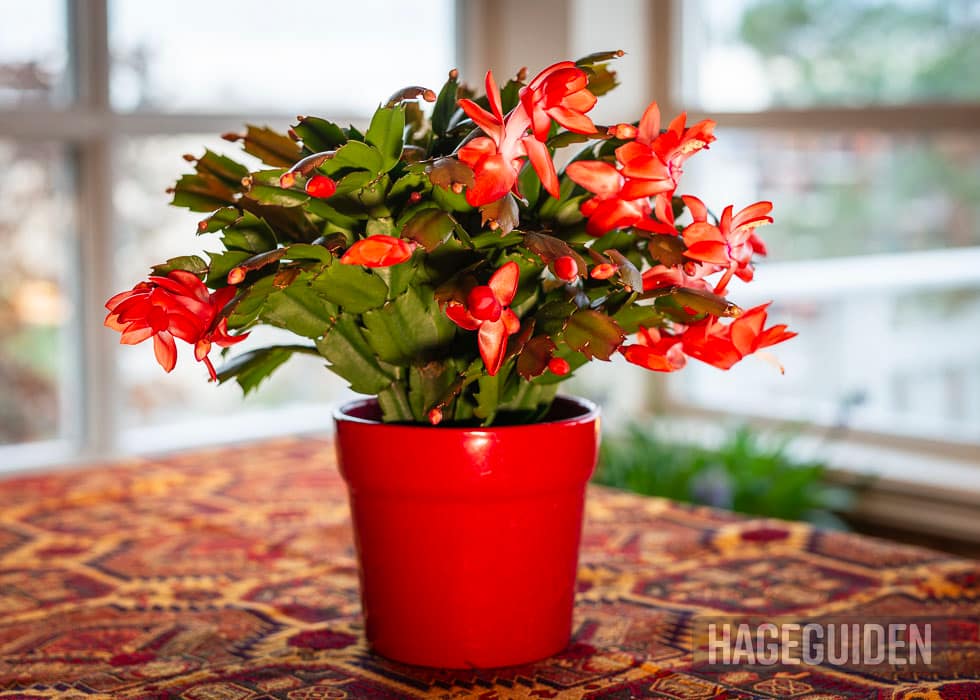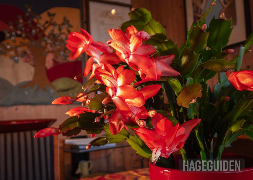 Sett novemberkaktusen i en rød potteskjuler, så har du en flott juleblomst. Kanskje blomstringen holder helt til jul.