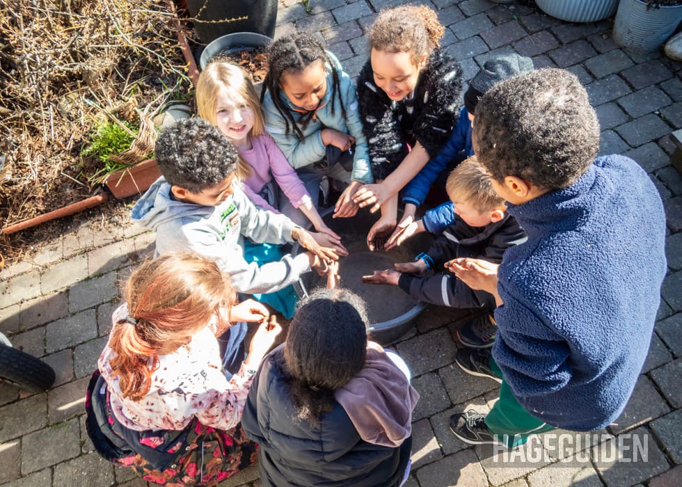 Etter endt økt i hagen, måtte alle vaske hendene. Deilig å få kjenne følelsen av jord!