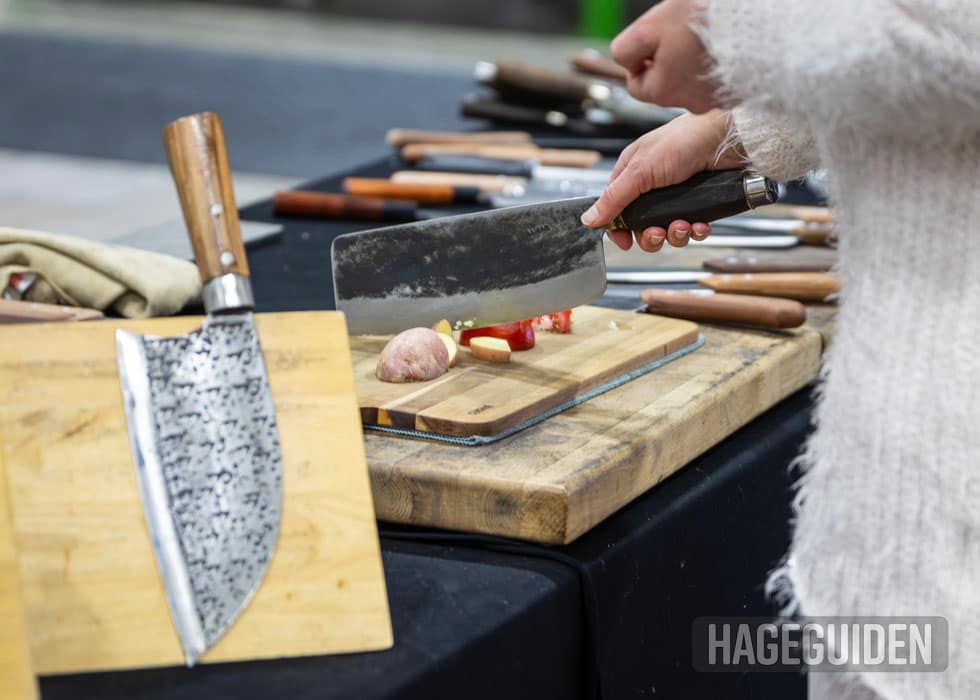 Her fikk potensielle kjøpere prøve hvor utrolig skarpe disse redskapene er. Det holdt nesten å bare legge den over potetbiten, så var den delt.