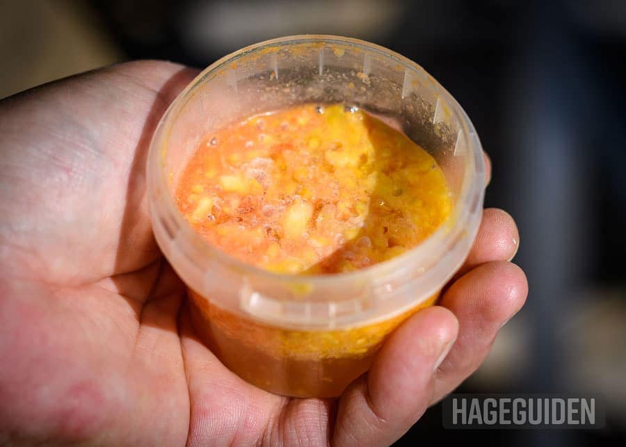 • Del tomaten i to og pirk ut frøene med en skje. Få med litt av geleen/saften, og legg det hele i en boks med lokk. Hell på litt vann.