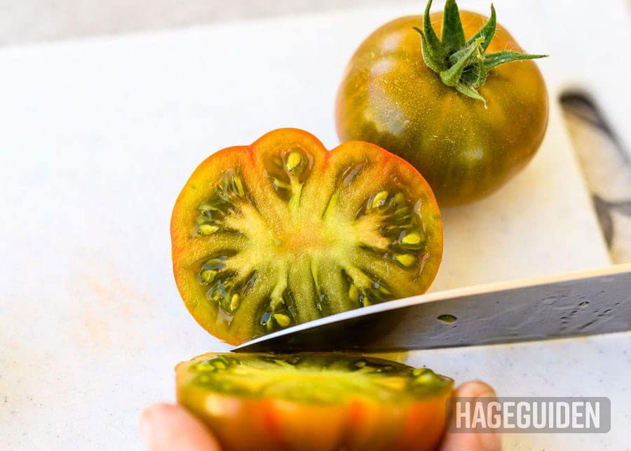 Når du skjærer opp tomaten vil du se at den inneholder mange frø. De kan du tørke og så.