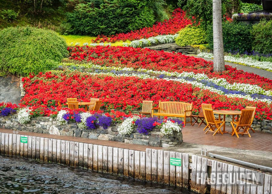 Det norske flagget av flittiglise og lobelia var «velkomstkomité» da vi besøkte Flor & Fjære.