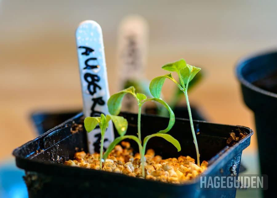 Aubergine er en annen varmekrevende vekst som har lang utviklingstid. Vi prøvde i fjor, sådde i mars og plantene ble aldri store nok til å være i nærheten av å gi avling. Aubergine er uansett ikke den enkleste veksten å få til, de fleste steder i Norge er den kun mulig å dyrke i drivhus, eller i beste fall på en solrik terrasse en god sommer. Vi gir oss ikke, men prøver igjen i år, og har sådd noen frø som står i en potte og trives foreløpig.