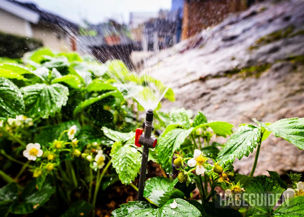 Det finnes flere gode systemer for automatisk vanning, både av krukker og bed. Vi fikk i fjor et vanningsanlegg fra Gardena med dryppvanning og tåkedyser, det fungerer kjempebra og er enkelt å tilrettelegge for forskjellige hager.