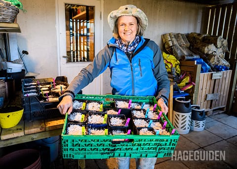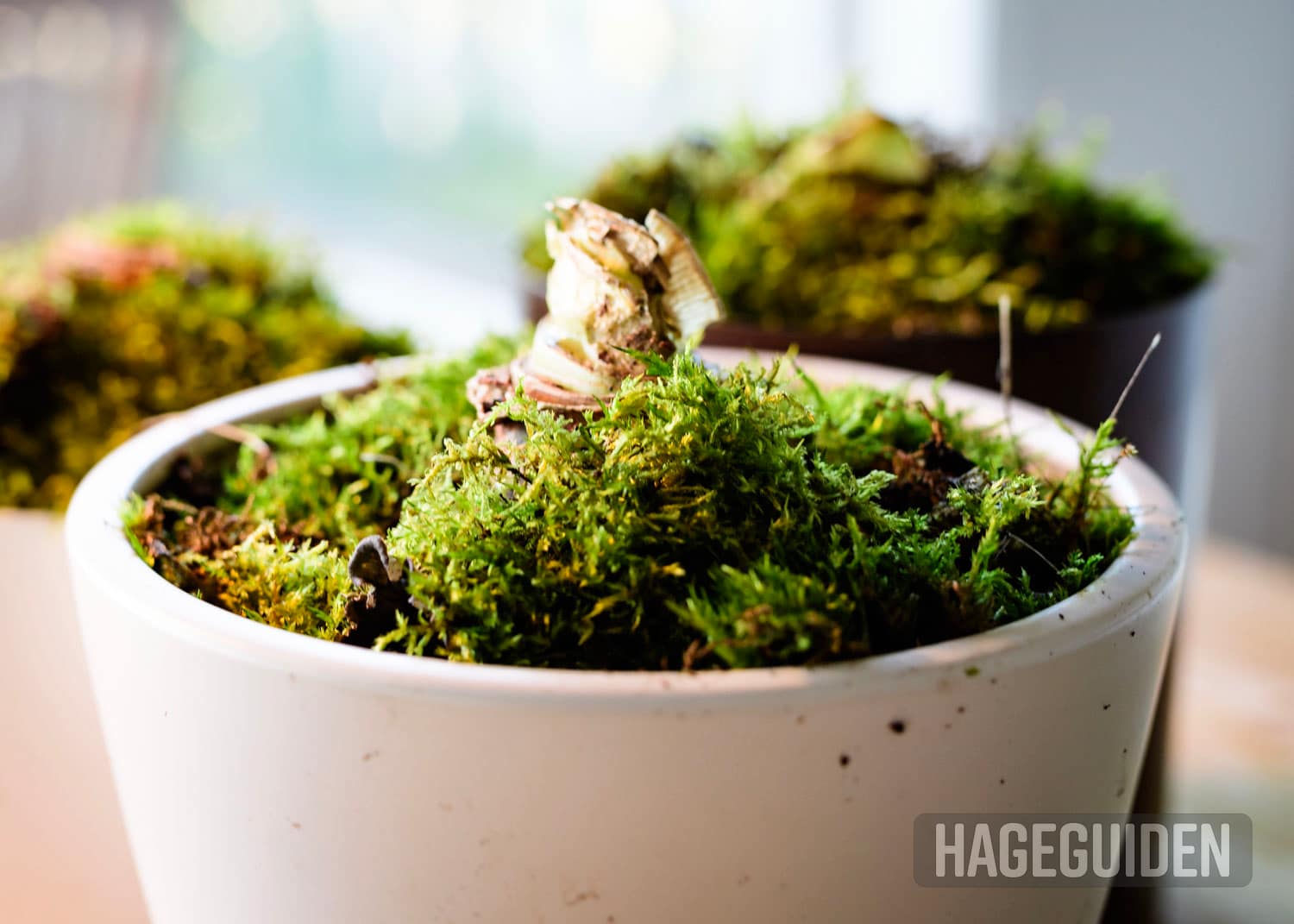 Toppen av løken skal stikke cirka 1/3 over jorda, men du kan pynte med mose etterpå.